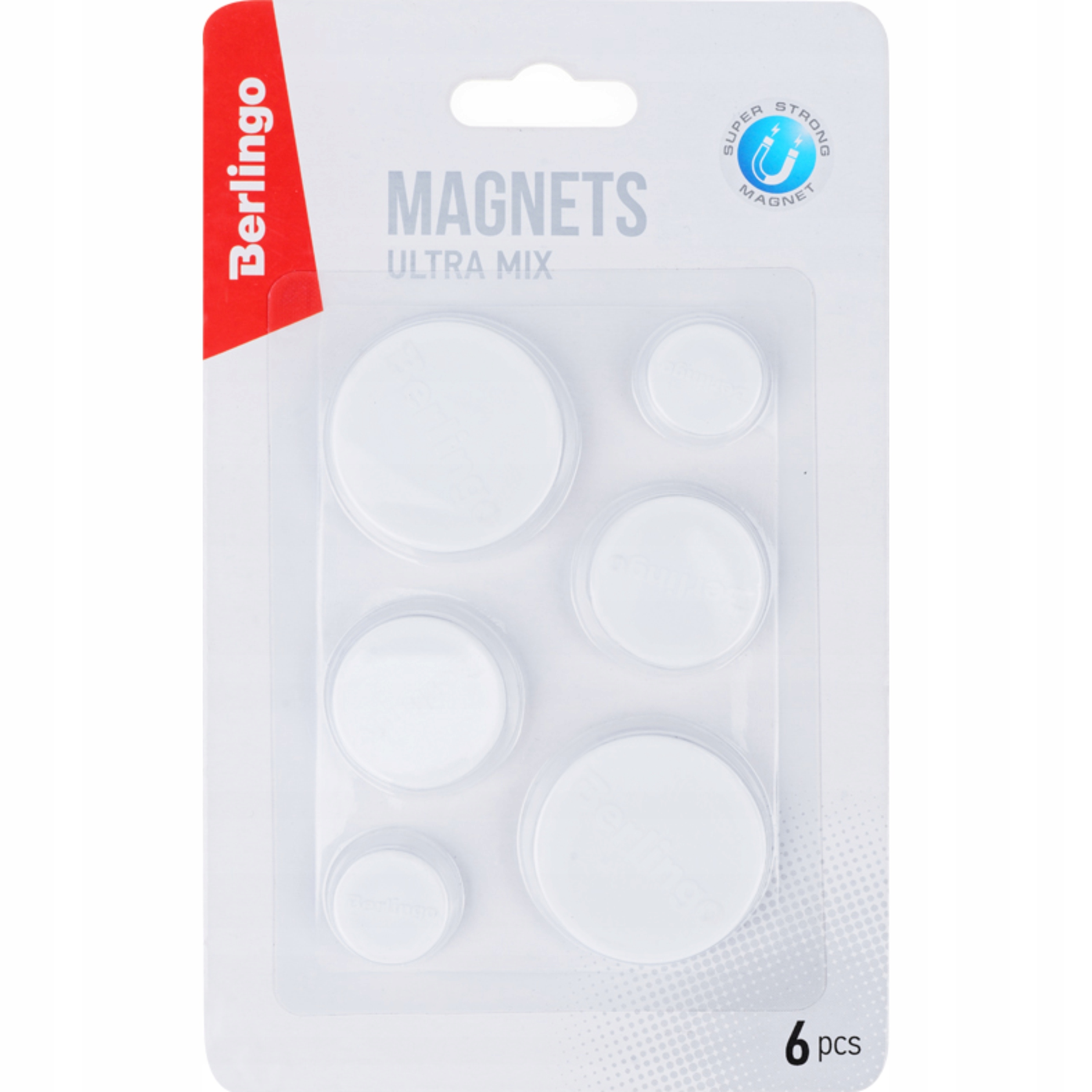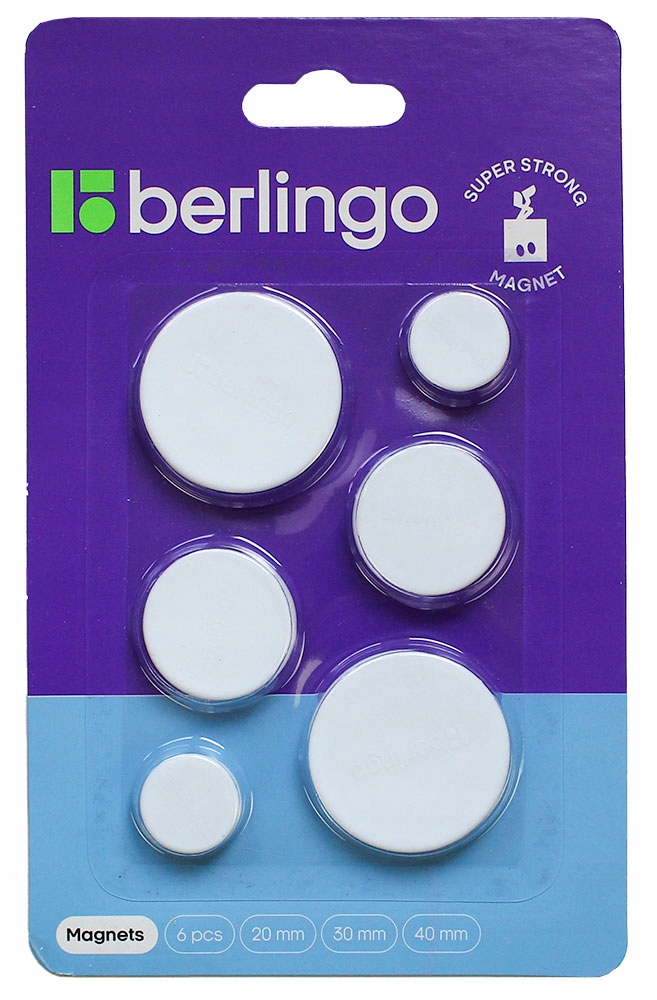 Zestaw składa się z 6 białych magnesów o różnych średnicach: 20mm-2szt, 30mm-2szt., 40mm-2szt.