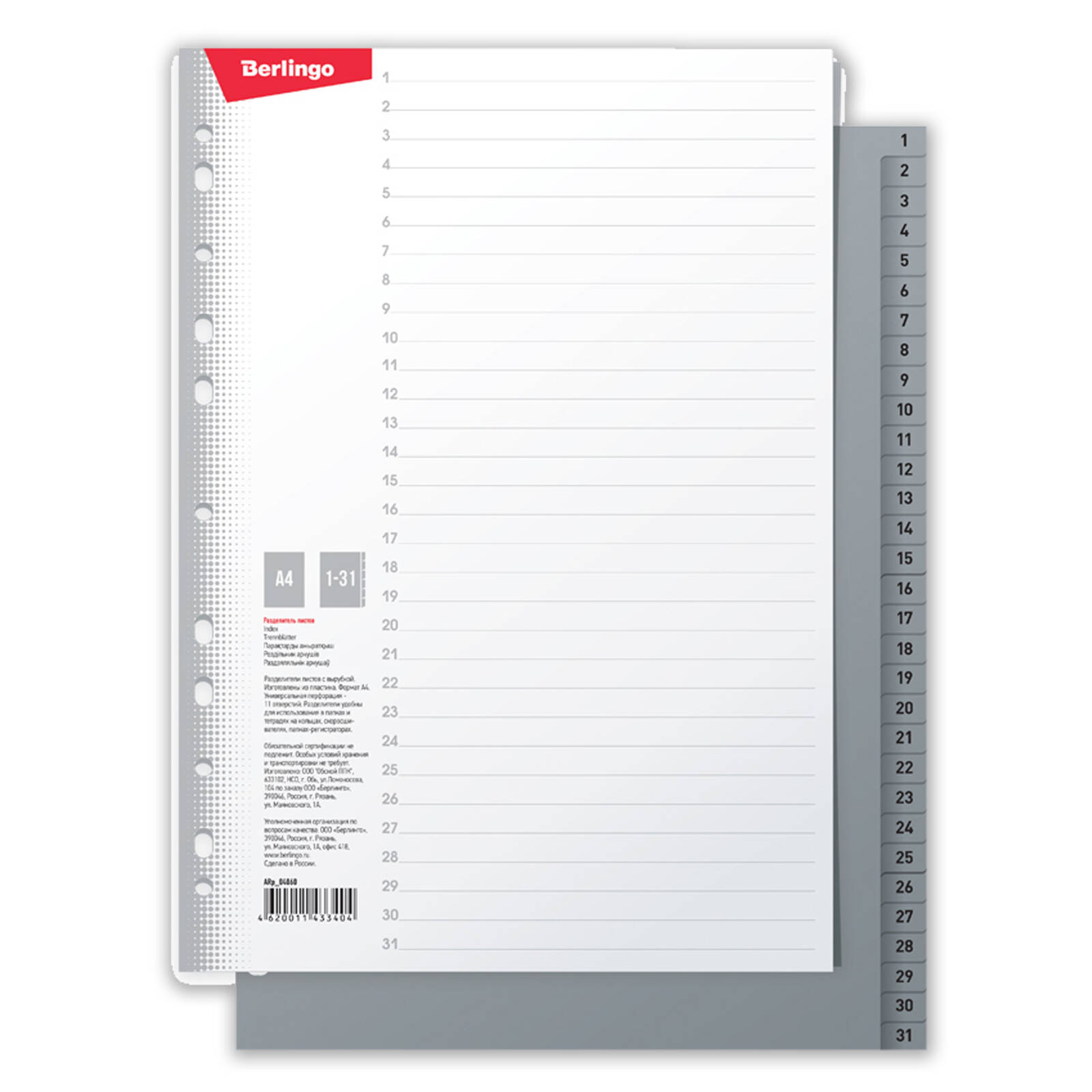 Opakowanie składa się z 31 arkuszy z indeksowaniem liczbami 1-31 w ciemnym szarym kolorze, co ułatwia nawigację w segregatorach i umożliwia bezproblemowe i szybkie odnalezienie wymaganych dokumentów.