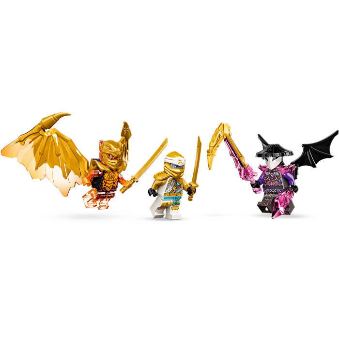 Ten zestaw konstrukcyjny ninja zawiera trzy minifigurki: złotego smoczego Cole’a z kolczastymi skrzydłami złotego smoka, a także złotego Zane’a i generała Vangelisa do odgrywania porywających walk dobra ze złem w mieście NINJAGO.